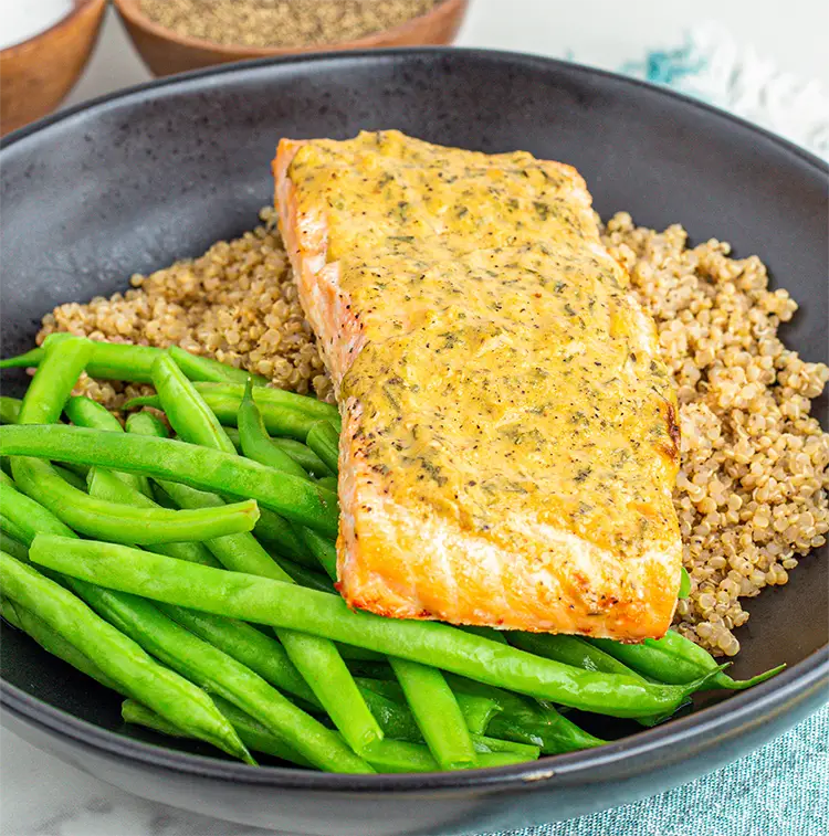 Fresh Atlantic Salmon baked to perfection with a homemade dijon mustard sauce on top. Served with fluffy quinoa that is seasoned with herbs and spices, and steamed green beans. Looking to have a deliciously healthy meal tonight? This dish is bursting with flavor and will be your new favorite at the dinner table! The quinoa is going to fill you up without feeling heavy, so you will have all the energy in the world to conquer your day.